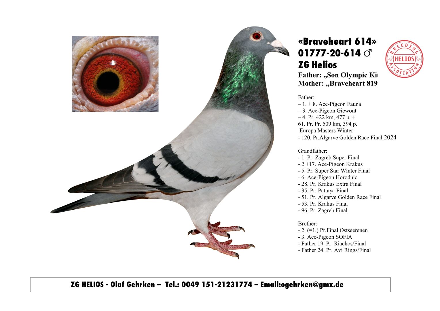 Die Nachkommen der ZG Helios-Stammvögel „Braveheart 1340“, „Sohn Noble Blue“, „ARES“ und „547“ bilden die Basis. Kombiniert wird diese mit dem Besten aus der Familie des „Romario“, u.a. Söhne und Töchter der Simon Wolf Stammtauben „911“, „1113“ und „199“; aus der Familie des „Kain“, „MESSI“-Sohn, Zdenek Pavlik; aus den Familie des „JERSON“ und der „Manu“ von Gerard Koopman sowie mit den Nachkommen der „Goed Grijs“, u.a. eine Tochter „EVA“ (Tochter „Goed Grijs“) das derzeitige Top-Reise und Zuchtweibchen bei Eijerkamp.